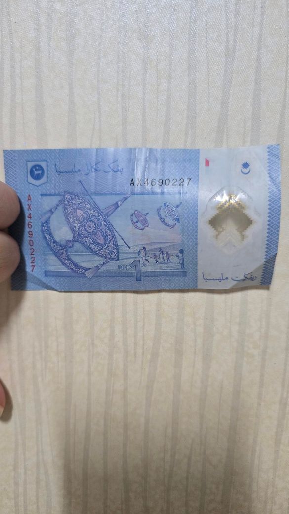사진에 나오는 지폐는 말레이시아 1링깃이며 톱니가 새겨진 링깃 지폐입니다