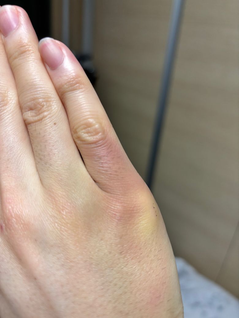 첫번째 사진은 저번주 금요일에 손 아래쪽을 크게 부딪혀서 많이 부었었는데 붓기는 가라앉았어요. 지금은 누르면 아프고, 약간 노란끼 있는 부분이 살짝 혹 같아보이네요. 크게 아프진 않는데 조심히 관리하면 따로 병원 갈 필요 없을까요? 혹시나 해서 의견을 묻습니다! 저번 답변해주신분들 감사합니다.