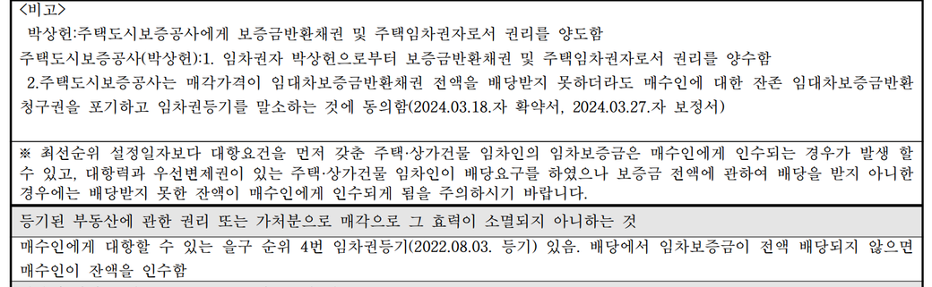 이미 임차인의 권리를 양수받은 주택보증공사가 권리 포기에 관한 확약서를 제출했기 때문에 보증금의 잔존에 대한 채무가 매수인에게 인수된다고 하더라도 매수인에게 잔존에 대한 채권을 청구하기는 힘들 것으로 사료됩니다.