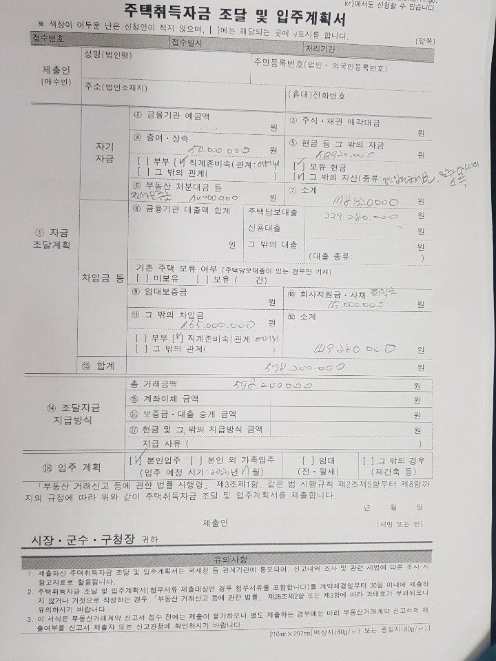주탬취득자금 조달 및 계획서는 말그대로 계획서 일 뿐이므로 어떻게 조달하겠다 내용만 기재하시고