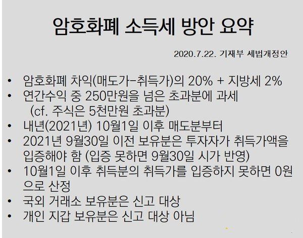 질문 내용과 같이 10월 이전에 처분하여 세금이 부과되는 것을 피하는 것이 뻔하니, 기존 보유한 암호화폐를 10월 이후에 처분할 경우 그 취득가액을 9월 30일의 종가로 간주합니다.