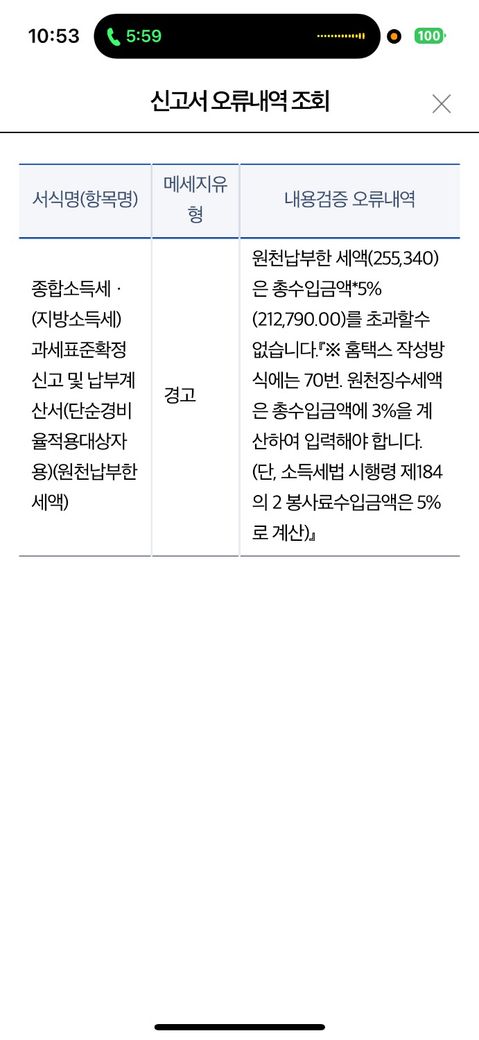 그 경고 오류로 신고 되면 잘못 신고된 것으로 추징 됩니다. 가산세는 많지는 않습니다.