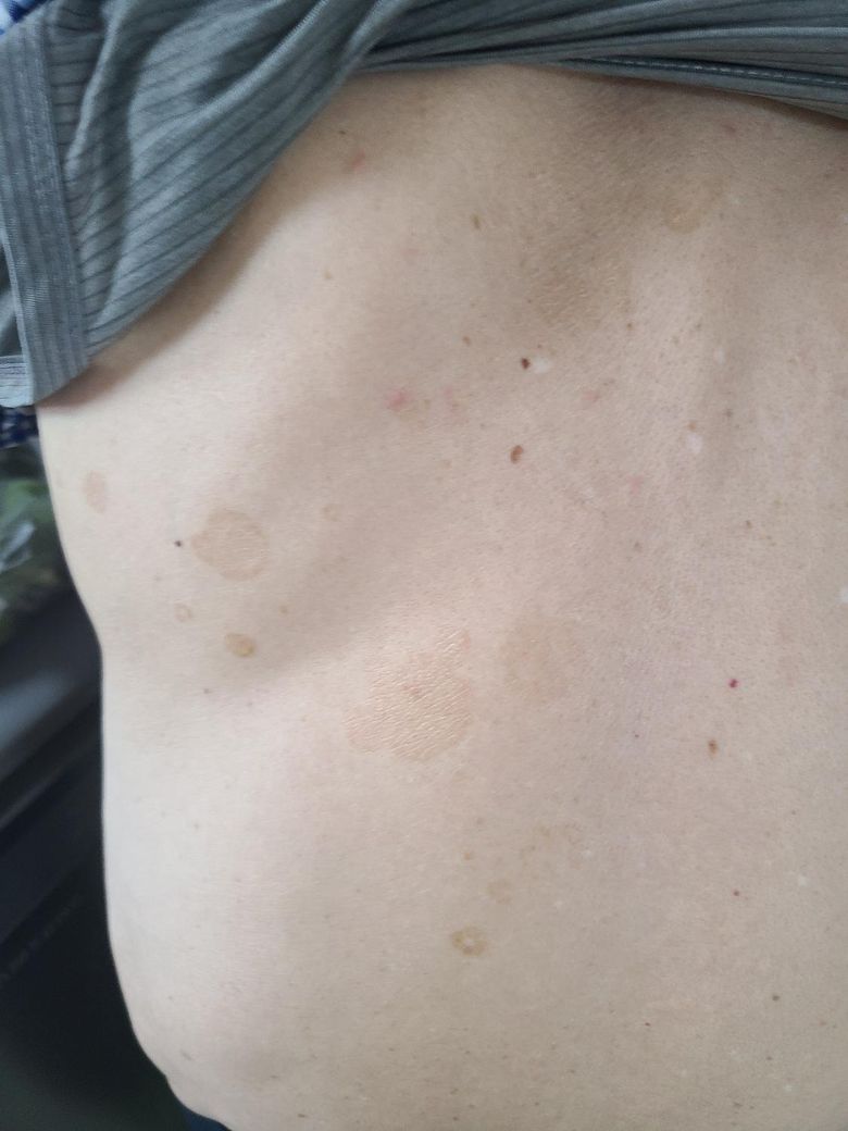어루러기처럼보입니다. 어루러기는 가렵지는 않은데 아니라면 백선도 의심이되어 근처 피부과 진료받아보세요. 어루러기나 백선 둘다 진균에 의한 질환이므로 꾸준한 치료가 필요합니다