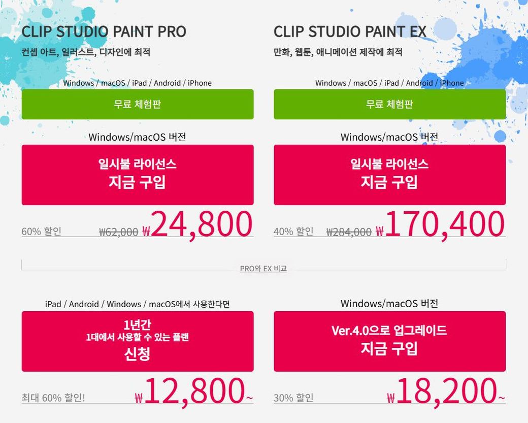 현재 제가 쓰는 클립 스튜디오가 버전 1인데 이번에 4.0 버전 프로가 세일중이더군요. 그래서 사려고 하는데 현재 보니깐 이렇게 4종류가 있던데 여기서 저는 왼쪽 상단에 있는것과 오른쪽 하단에 있는 업그레이드 중 어느걸로 사야하나요?