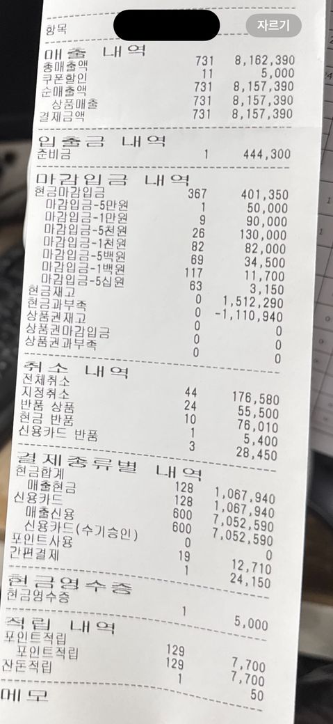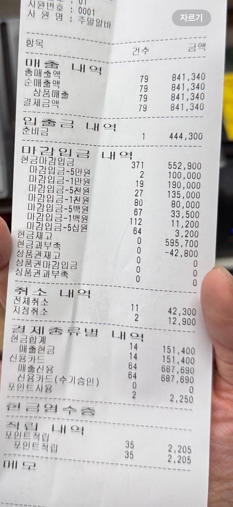 오늘 5시에 교대하고 제가 마감까지 있었는데 아무래도 계산 실수 안한 거 같은데 현금과부족이 -42,800원이 찍혀있더라구요… 예전엔 많이나도 천원 대였는데 갑자기 이러니까 이유를 못 찾겠어요.. 근데 오늘 교대한 분이 원래 주말 오전에 안나오시는 분인데 오늘 나오셧더라구요 그래서 원래 정산내역서에 적힌 ‘현금마감입금’ 에 적힌 금액을 적었는데 그분은 ‘준비금’(444,300) 에 적힌 금액을 입력하셨는데 여기서 문제가 생긴 걸 까요?