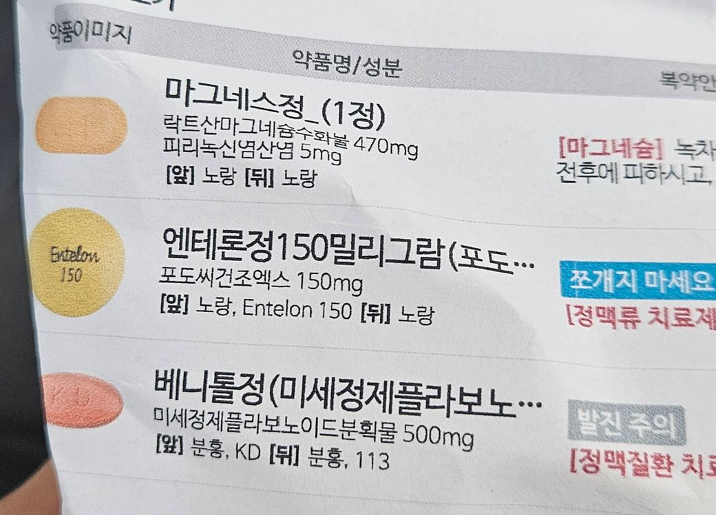사진 속 처방약(마그네슘, 엔테론, 베니톨)은 커큐민, 오메가3, 비타민류, MSM과 함께 복용해도 큰 문제는 없습니다. 다만 오메가3와 엔테론은 혈액순환을 돕는 성분이라 멍이 잘 드는 분은 주의가 필요합니다. 마그네슘은 흡수 간섭을 줄이기 위해 일부 영양제와는 2시간 정도 간격을 두는 것이 좋습니다. 전반적으로 식후 나눠 복용하면 무난합니다. 감사합니다.