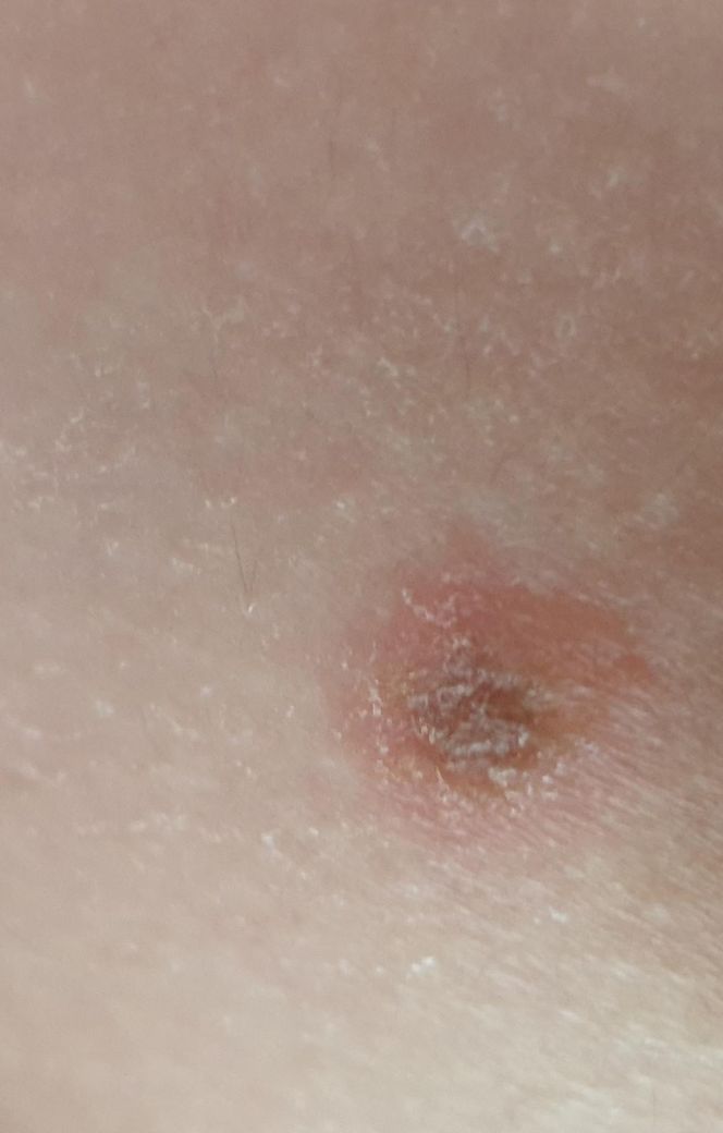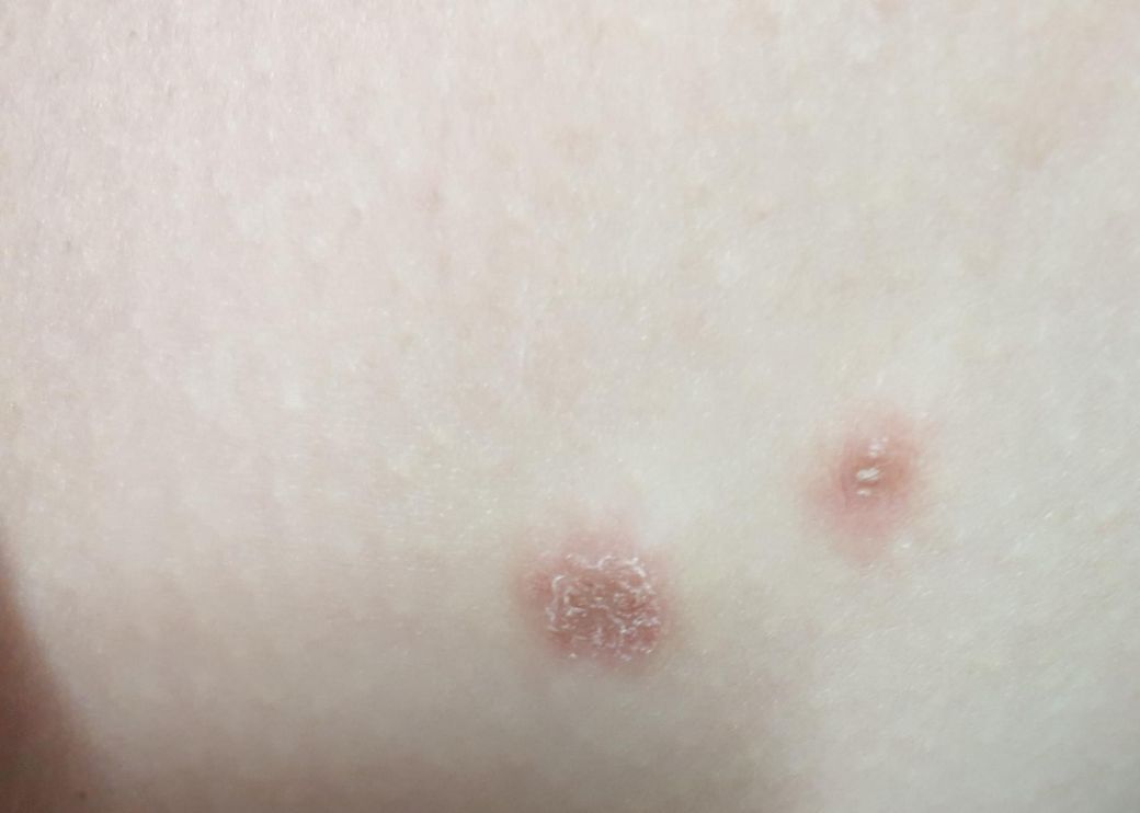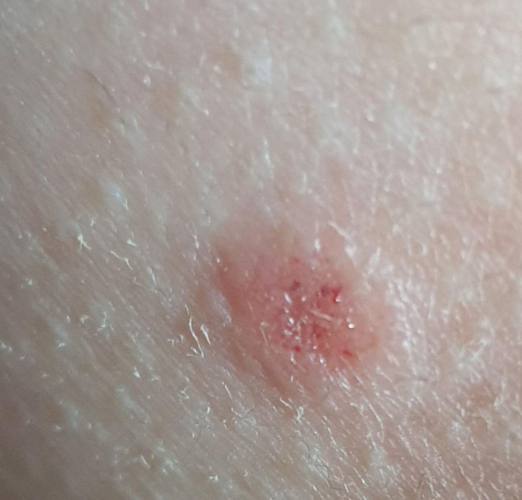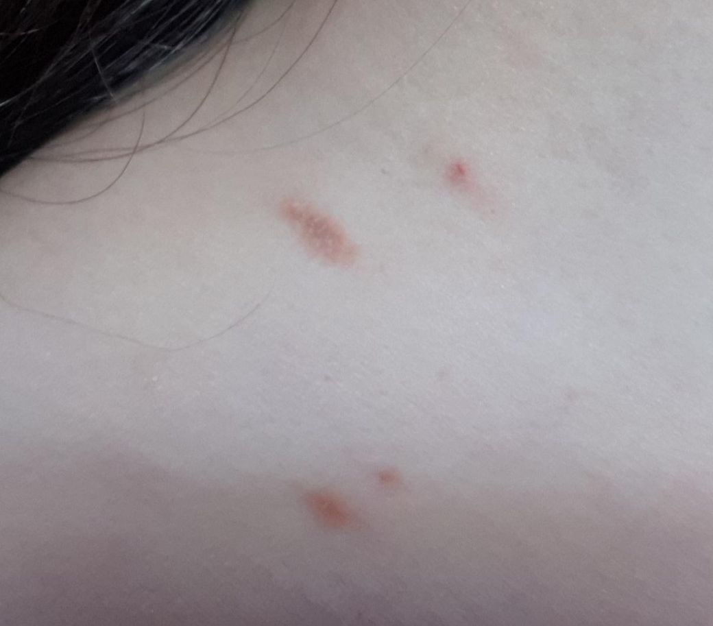 목 등 가슴 다리에 빨간 게 갑자기 생겼어요. 몇 개는 세 번째 사진처럼 딱지?같이 갈색이 되고 있고 몇 개는 첫 번째 사진처럼 빨개요. 빨간 것 중에도 갈색처럼 큰 게 있습니다. 가렵지는 않고 아프지도 않아요.