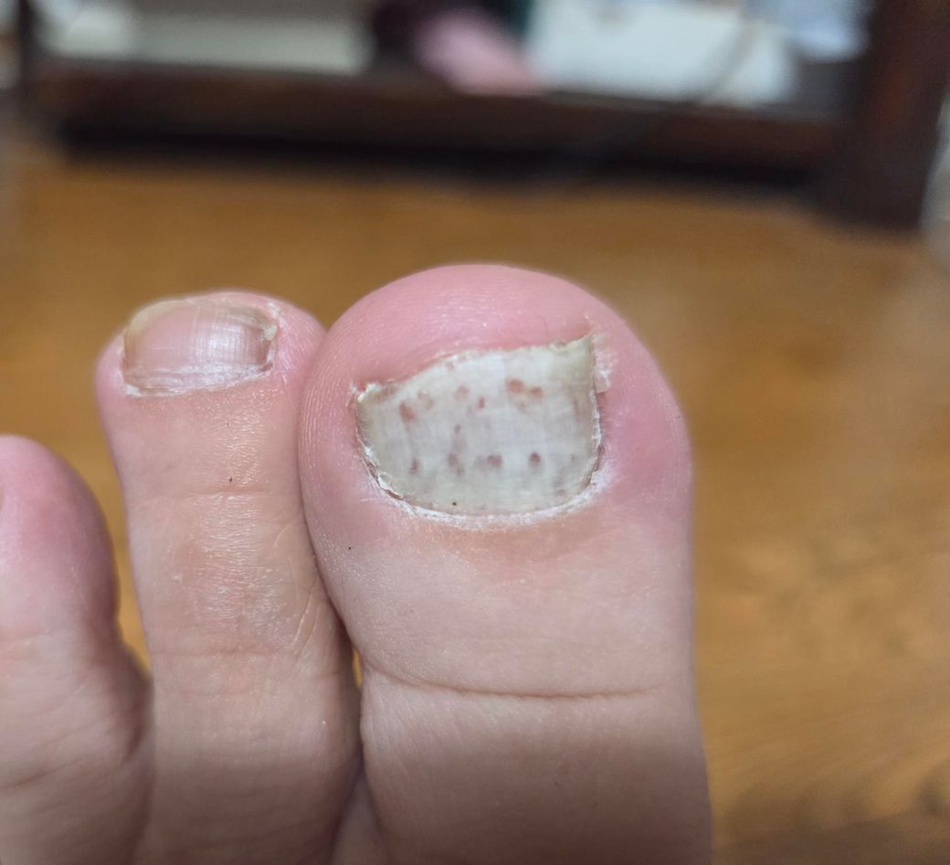 사진상 엄지발톱이 전체적으로 백색 혼탁을 보이고, 내부에 점상 적갈색 반점이 보입니다. 발가락 사이 가려움과 인설이 동반된다면 조갑진균증(발톱무좀) 가능성이 높습니다. 무좀이 심해지면 발톱이 하얗게, 누렇게 또는 두껍게 변할 수 있습니다. 백색으로 보이는 경우는 표재성 백색형 또는 조갑하 각질 증식에 의한 혼탁일 수 있습니다. 점상 출혈처럼 보이는 부분은 외상성 출혈 가능성도 있으나, 진균 감염에서도 동반될 수 있습니다.