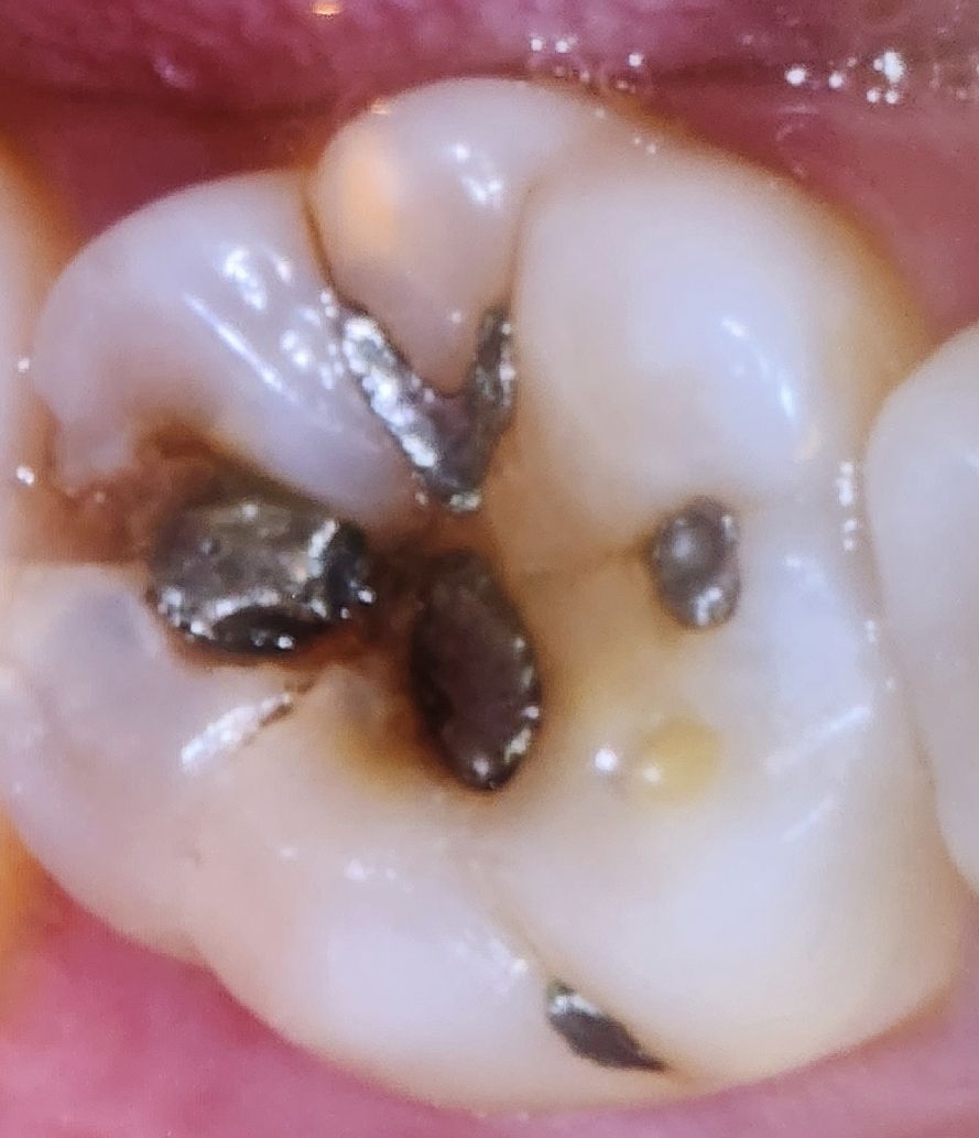 1. 기존 수복물(아말감)의 일부 탈락도 있고 탈락된 부위 하방으로 이차충치도 있습니다.