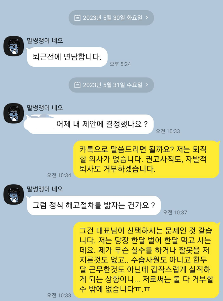 제안 자체가 모두 저에게 불합리한 조건이라 캡쳐 이미지처럼 두가지 제안을 모두 거부한 상태인데 "정식 해고절차를 밟으란 얘기냐?"라는 답변이 오고 이후 언급이 없는 상태인데... 저것도 해고 통보 예고로 효력이 있을까요? 해고 예고 통지서를 받거나 한 건 없습니다. 그러면 해고예고수당도 받을 수 있을까요?