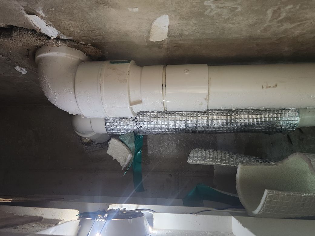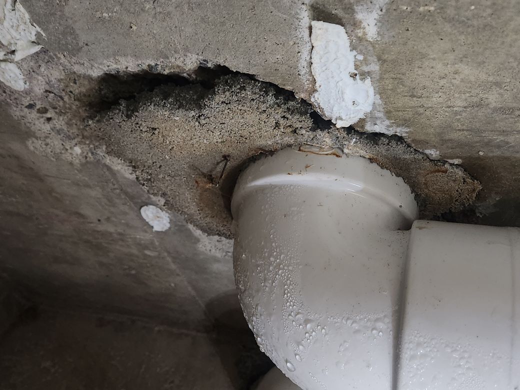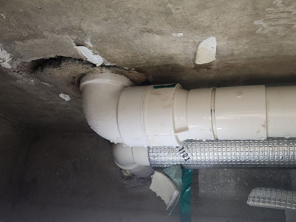 해결이 되고요. 문제는 오수배관을 윗집 아저씨가 건드려서 구배(각도)도 안 맞고 천장 콘크리트 슬라브도 파손이 되어 있습니다. 그래서 이 부분 공사도 해야 됩니다.
