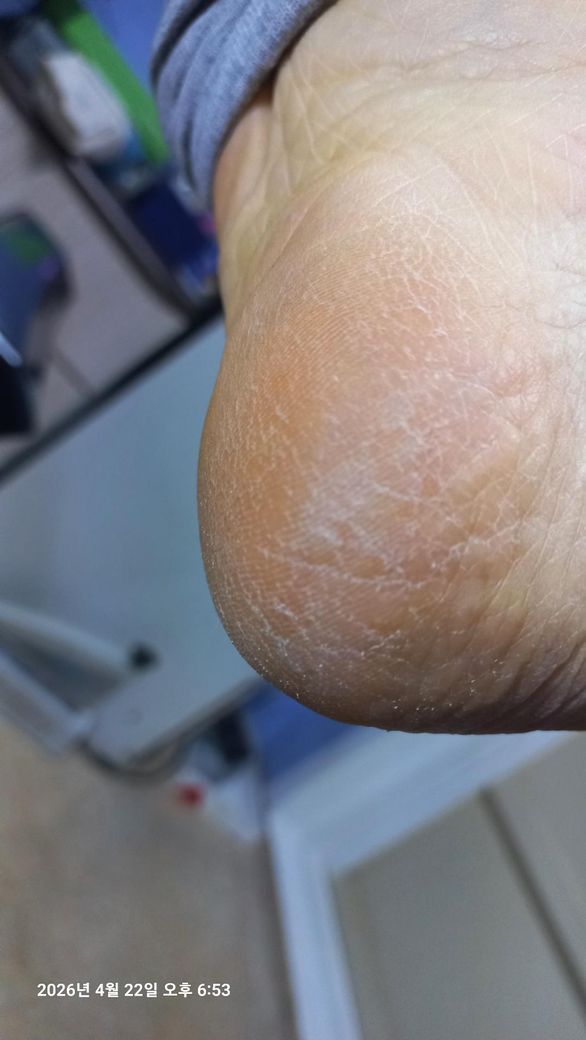 올려주신 사진을 보니 발뒤꿈치 피부가 두꺼워지면서 하얗게 일어나고 미세하게 갈라지는 소견이 관찰됩니다.