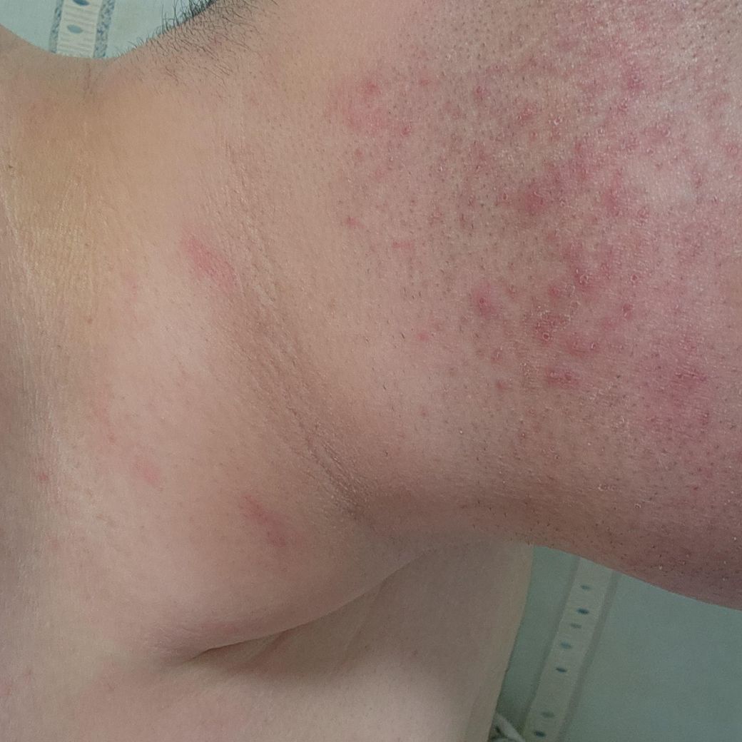 네 면도날로 피부를 손상시키고 이로 인해서 모낭염이 발생한 상태로 보입니다.