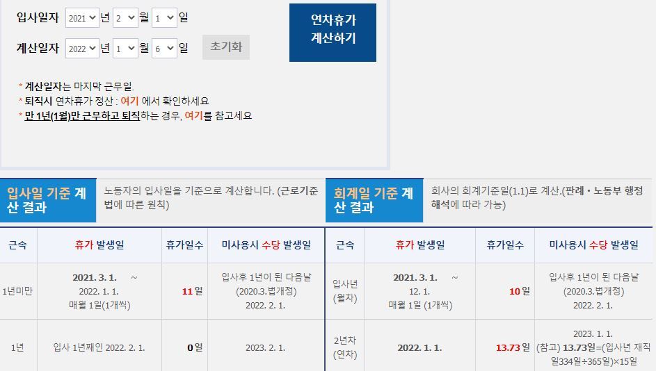 - 다만, 연차휴가 산정기간을 회계년도 기준으로 전 근로자에게 일률적으로 적용하더라도 근로자에게 불리하지 않아야 하므로 퇴직시점에서 총 휴가일수가 근로자의 입사일을 기준으로 산정한 휴가일수에 미달하는경우에는 그 미달하는 일수에 대하여 연차유급휴가 수당으로 정산하여 지급하여야 합니다