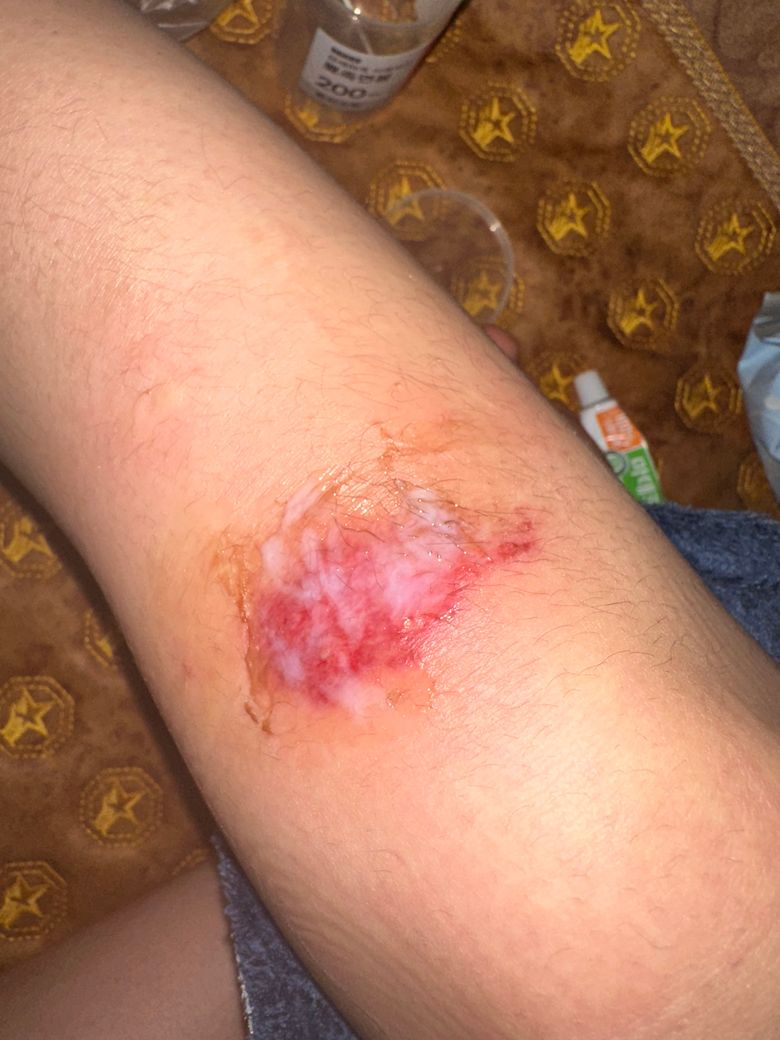 찰과상이 크게 생긴 상태로 보이는데 관련하여서는 드레싱을 꾸준히 해주면서 관리하는 것이 최선입니다. 빠르게 낫게 하는 특별한 방법이 따로 있지 않습니다. 물이 닿는 것은 좋지 않을 수 있으므로 샤워를 위해서는 방수밴드 등을 부착하고 활용해보시길 권고드립니다.