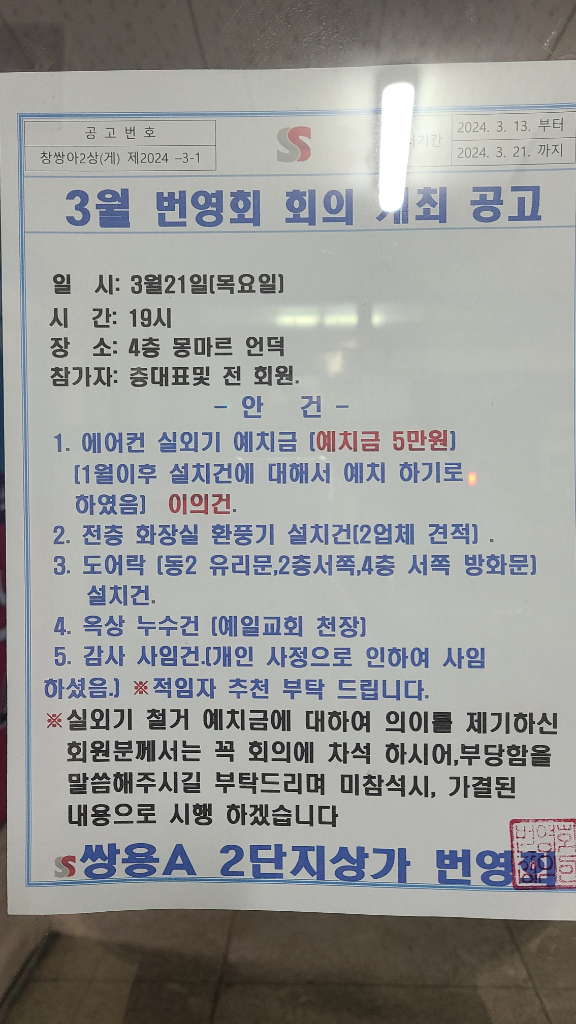 앞전에 상가 관리비에 새로들어오는 세입자에게만 부과하는 간판비, 에어컨실외기 보증금에 대해 문의를 드렸습니다. 답변주신 불공평성에 대해 그대로 전달을 했는데 내용을 전달했을때 알겠다는 답변이 와서 끝난줄 알았는데 오늘 상가 공고문에 회의에 와서 직접 반박하지 않으면 가결해서 부과하겠다는 말을 써놓았네요
