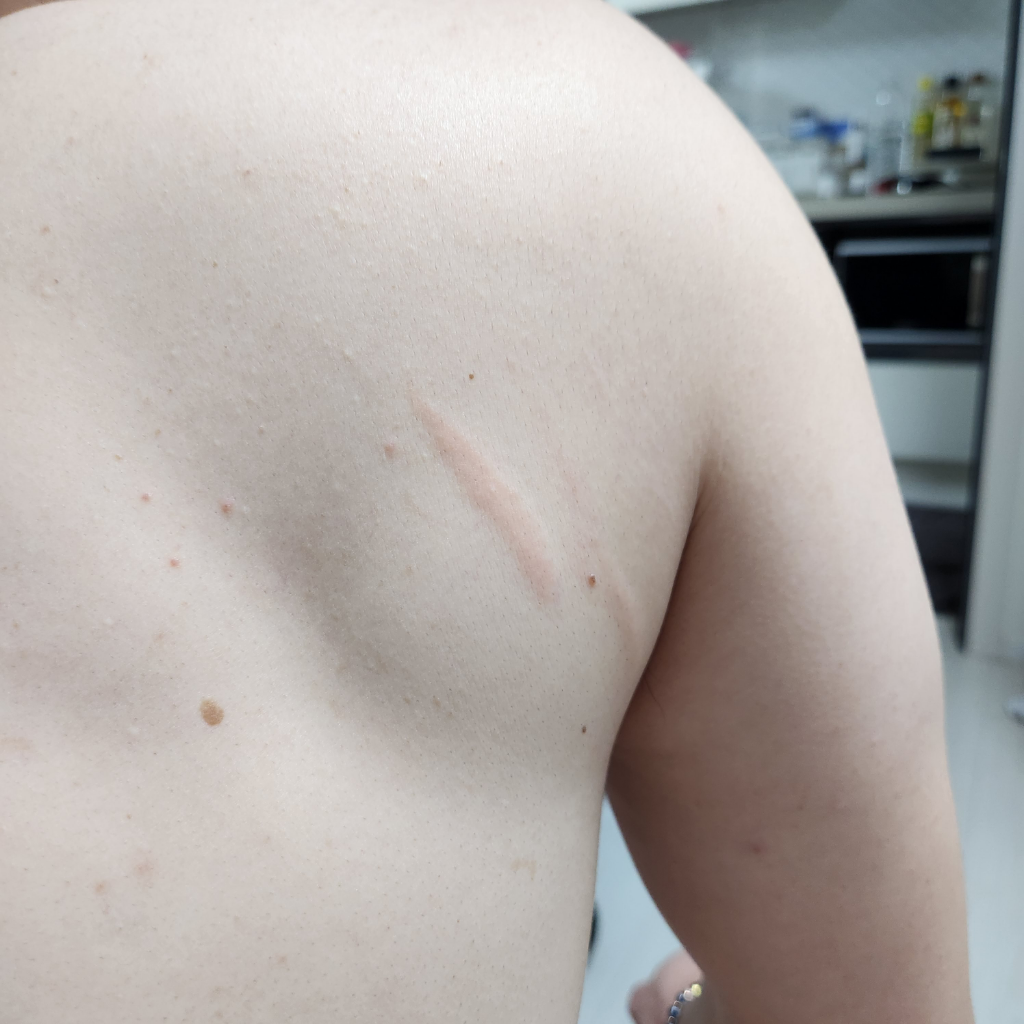 피부묘기증 처럼 일어나는데 긁어봐도 재현되지는 않습니다.