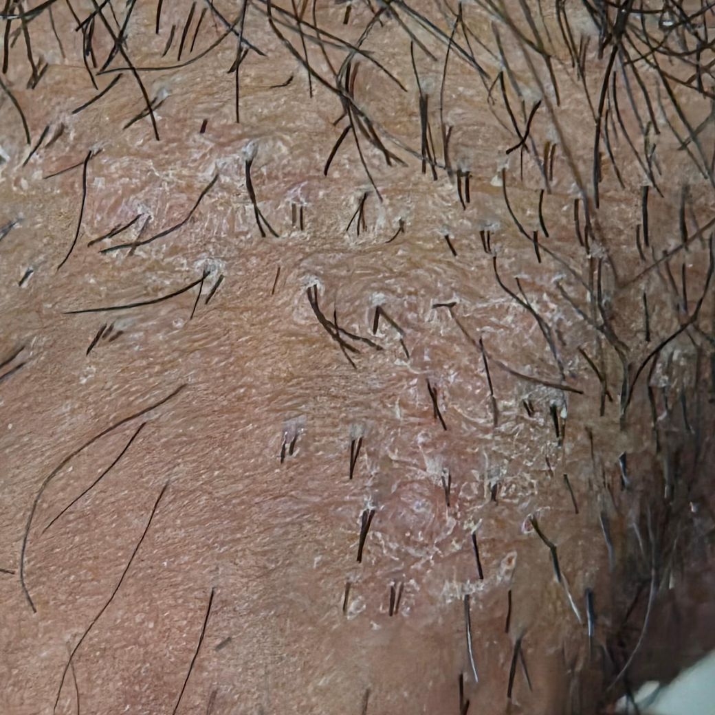 남성 음모 부근 가끔씩 가려워요. 아래 사진처럼 하얀 각질이 보입니다. 병원 1회 갔었는데 바르는 로션만 처방받았었어요. 시간 지나니 동일 증상이 지속 발생하네요. 원인이 뭘까요?