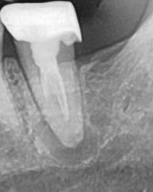 사진으로 봐서는 뿌리끝에 큰 병소가 있는 것으로 보입니다. 이런 경우 치아 신경관 내부가 감염되었다면 재신경 치료를 해서 감염 물질을 제거해 줄 수 있습니다.