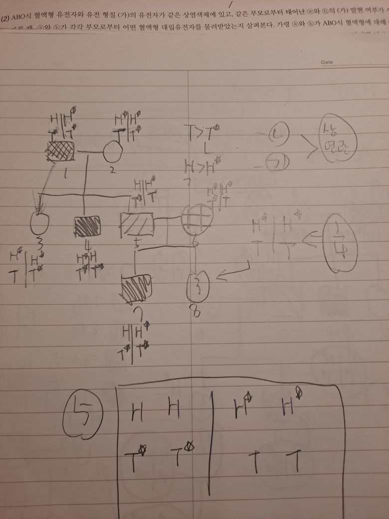 6번은 ㄴ형질만 발현되었으므로 H'H'T'T' 일 것입니다. (직접 푸신 것에서는 6번 T에서 실수를 하신 것 같습니다.)