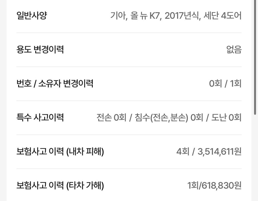 k7차량을 쭉 보다가 하나를 발견했는데요. 따로 하자도 없어 보이고 렌트이력도 없는 차량입니다. 리콜 완료도 된 차량이구요. 색상은 검정색인데 조건이 정말 좋은 차인거 같은데 가격이 1080만원인데 왜이렇게 쌀까요?? 구매해도 되는 차량인지 문제가 있는 차량은 아닌지 여쭤보기 위해 질문드립니다.
