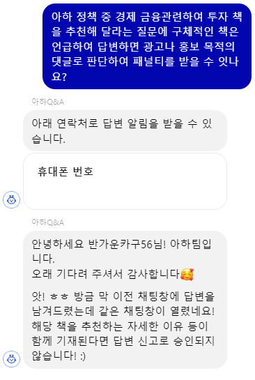아하 고객센터에 문의한 결과 경제 금융 관련하여 구체적인 투자 책을 언급하면 패널티를 받을 수 있냐는 질문에 "해당 책을 추천하는 자세한 이유 등이 함께 기재된다면 답변 신고로 승인되지 않습니다!" 라는 답변을 받았습니다.