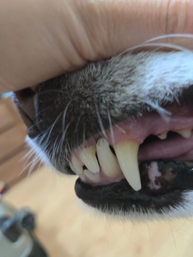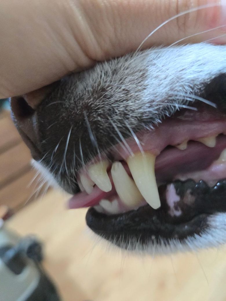 강아지 아랫니 송곳니가 끝이 부러진 것 같아요 ㅠㅠ 치료받아야 할까요? 작년에 큰 치아 부러져서 발치받았는데 그땐 치수가 보이긴 했거든요. 또 발치해야 하는건지.. 살짝 회색 부분 이 보이는거같아서 사진 첨부합니다!