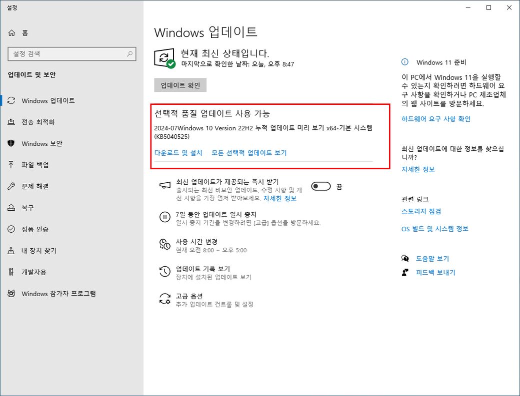 윈도우 업데이트 - '선택적 품질 업데이트 사용 가능 ' 업데이트 해야 될까요?