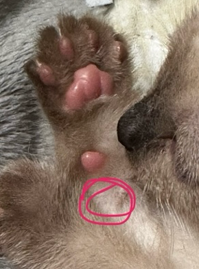 다른 발에 동일한 위치에 같은 양상의 덩어리가 있다면 촉각모의 융기 부분일 가능성이 있으나 그렇지 않다면 질병 상태를 의미하니 동물병원에 데려가서 진료 받으시기 바랍니다.