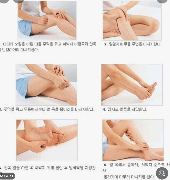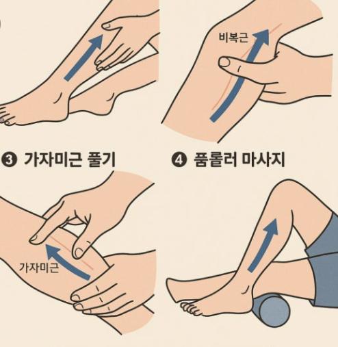 앉은 자세에서 손으로 쥐듯 주무르거나, 종아리를 아래에서 위로 쓸어주는 마사지가 좋아요.
