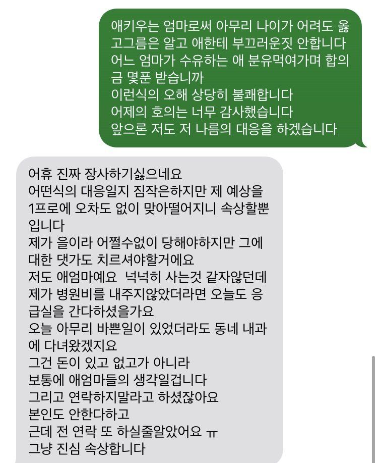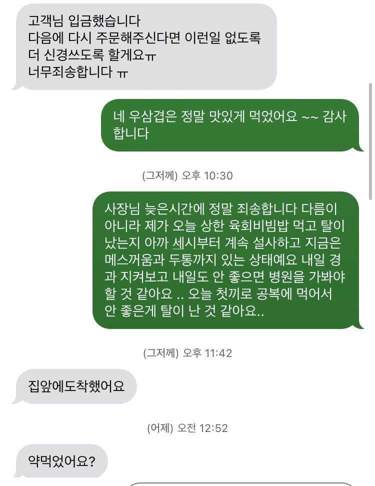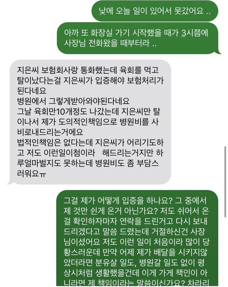 다음 날 더이상 배가 아프지않아 괜찮은 것 같다고 문자를 드렸고 오후 12시쯤 밥을 먹었습니다 밥 먹고 세시쯤부터 다시 배가 아프기 시작하더니 또 계속 설사를 해서 한동안 애기는 분유 먹이고 저는 지사제 먹으려고 사장님께 연락을 드렸고 사장님께서는 병원에 가라고 하셨지만 제가 애기를 맡길데가 없어서 병원에 가지 못하는 상황이었습니다 9시쯤에 애기 맡기고 응급실을 가겠다고 하나보험처리를 하려면 육회비빔밥을 먹고 탈이 났다라는 증명서를 받아와야해서 불가능하다고 하시며 법적으로 자기가 책임져야할 의무가 없는데 도의적인 책임으로 병원비를 내주려고 한다 하지만 응급실은 부담이 된다 라고 말씀하셔서 저도 배달을 시켜먹지않았으면 평소와 같은 생활을 했을 것이다 라고 말씀드렸고 사장님께서 어떻게 해주길 원하냐고 하셔서 제가 나을 때까지 병원비를 내주셨으면 한다고 해서 알겠다고하고 통화가 끝났습니다.