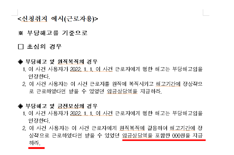1. 금전보상으로 신청 시 일단 빨간색으로 표기한 부분은 '임금상당액을 지급하라' 라고 금액없이 기재해도 되나요?