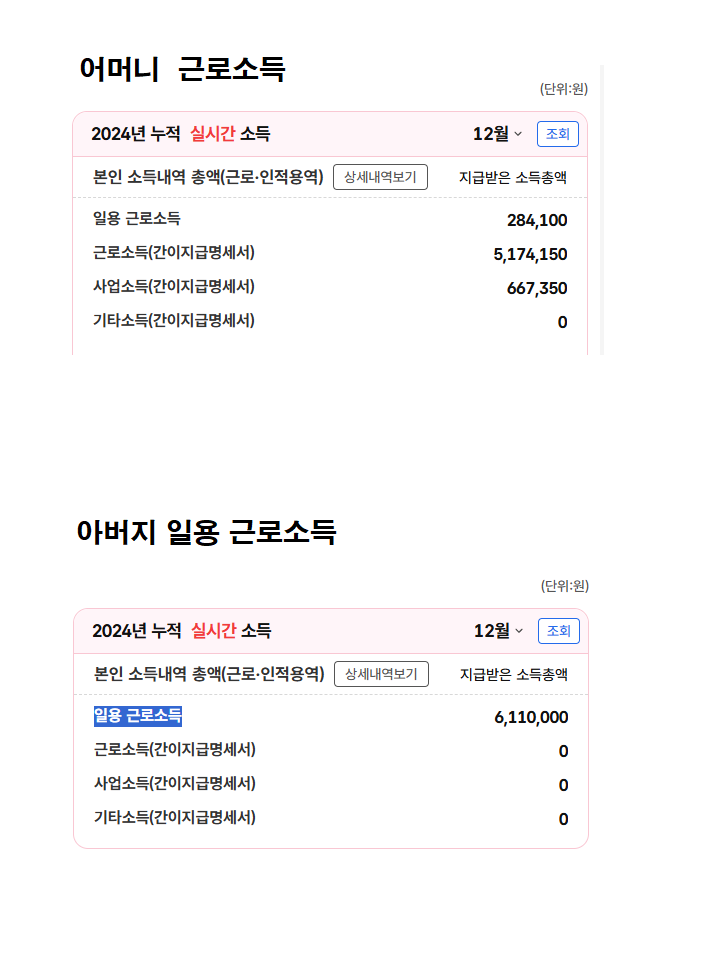 어머니가 근로소득이 517만원 , 아버지가 '일용 근로소득'의 경우 611만원이라면