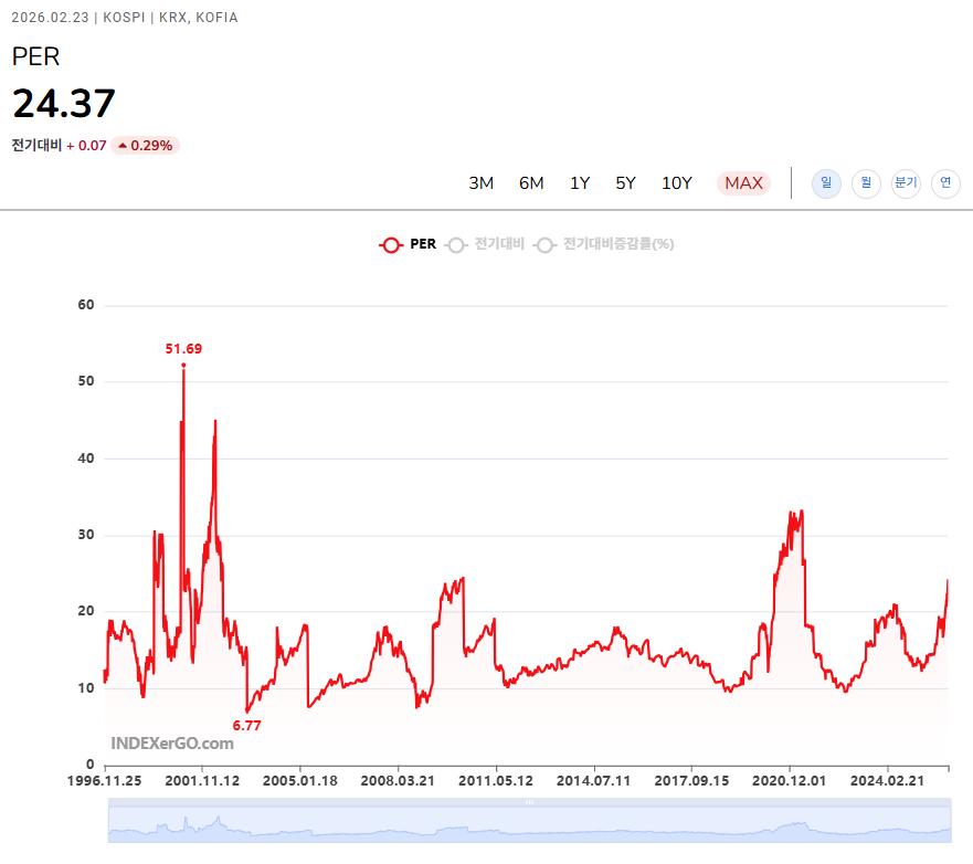 코스피 PER이 24인데, 이거는 좀 높은 수치입니다. 코로나때 그냥 사면 오르는 때보다는 아닙니다만, 좀 높습니다.