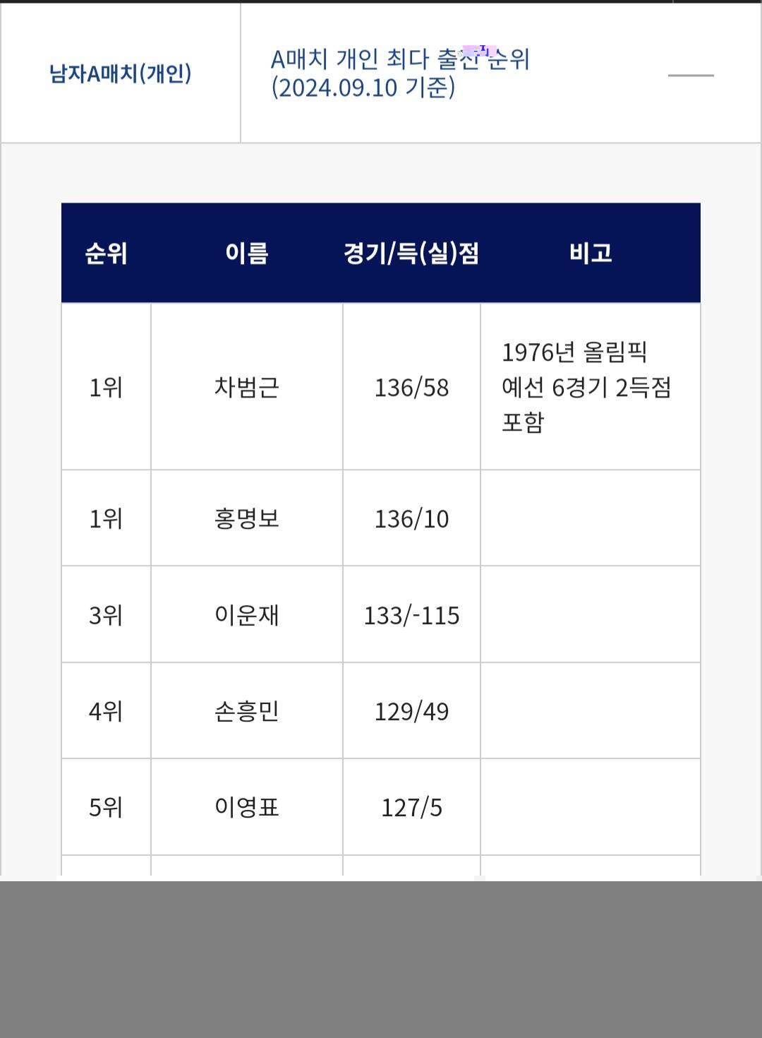 공동 1위로 차범근과 홍명보가 136경기, 3위로 이운재의 133경기가 있습니다.
