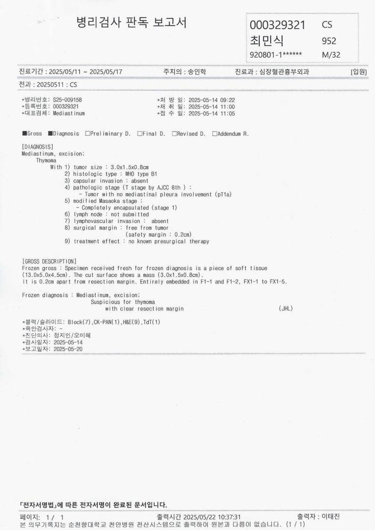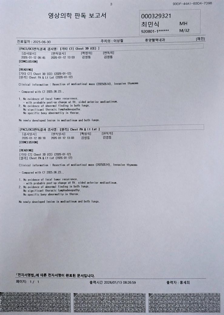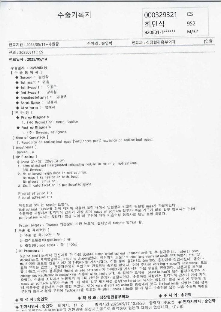 흉선종으로 인한 흉강경 수술 후 1년, 갑자기 찾아온 가슴이 눌리는 느낌