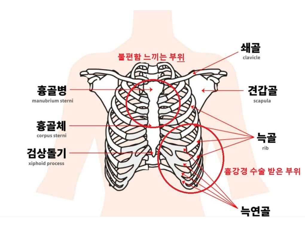 제가 2025년 5월에 흉선종 수술을 받았는데 당시 오른쪽 늑골 쪽 구멍을 3개 내는 흉강경 수술을 받았습니다.