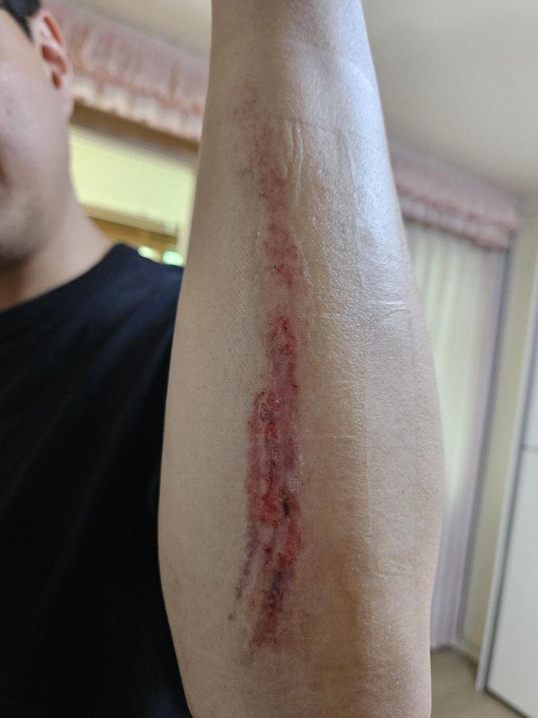 수영장에서 넘어지면서 팔을 쭉 긁혔는데요.