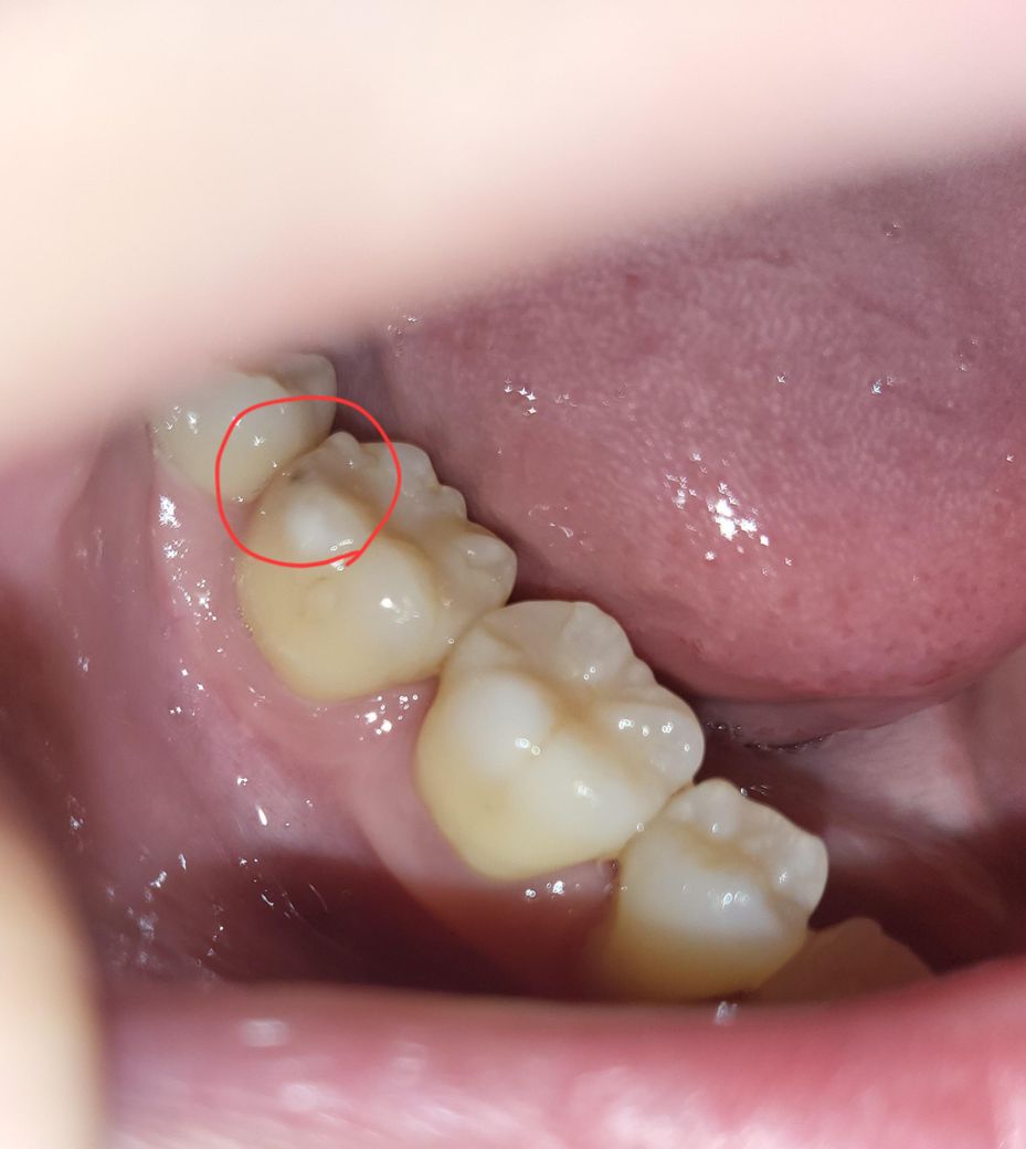 사진상으로는 충치가의심이 됩니다. 충치가 정지형인지 진행형인지 확인해보기 위해 치과에 방문하여 진료를 받아보길 권합니다.