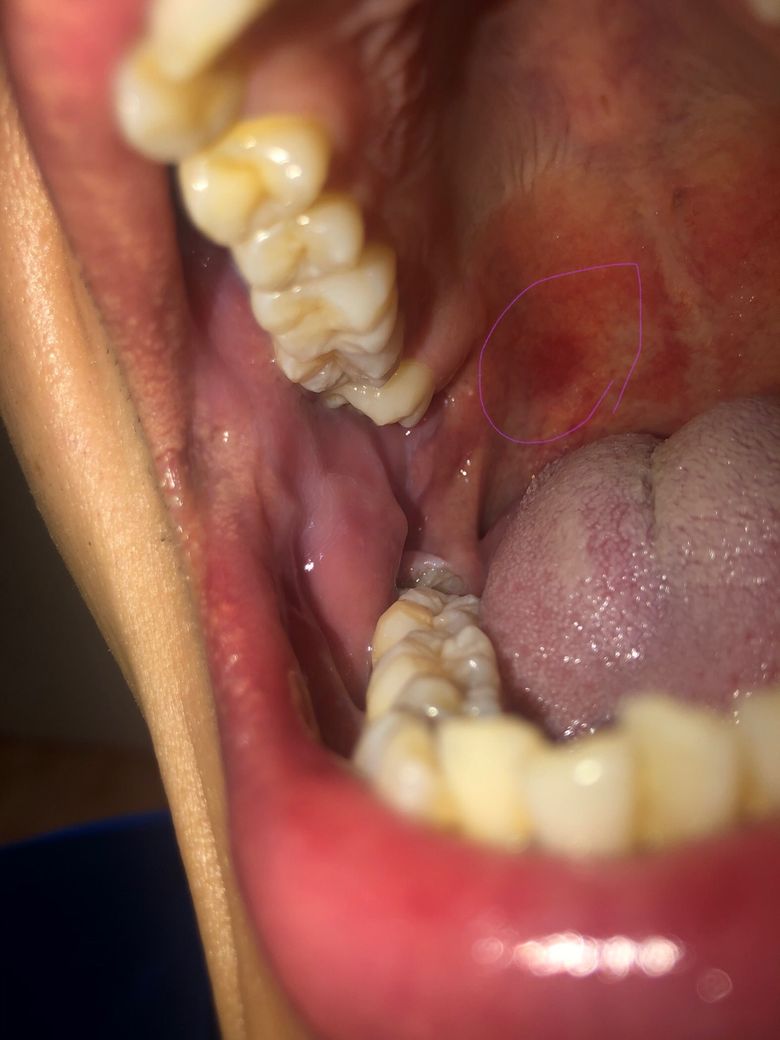 잘려고 누울려고 하니 침을 위로 삼킬려고 하니 통증 있어서 거울에 입안을 들여다보니 저가 파란색 부분에 빨갛게 동그라미처럼 있고 그 바로 왼쪽 옆을 누르면 뭔가 튀어나온 부분이 있는데 누르면 통증이 있는데 왜 그런건가요? 반대변은 누르면 안아프고 빨갛게 동그라미가 없는데 저거 빨갛게 동그라미 있는거는 이상이 있는건가요? 어떻게 해야 하는지 알려주세요.