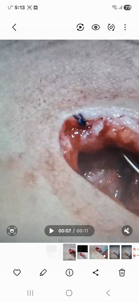 어떤 상황인지도 모르는 상황에서 단순히 사진만으로는 정확히 단정하기는 어렵습니다. 말씀하신 것처럼 색이나 모양은 봉합사처럼 보이기도 합니다. 다만 실제로 꿰맨 적이 없다면, 왜 그 자리에 실이 있는지 설명이 잘 되지 않습니다.