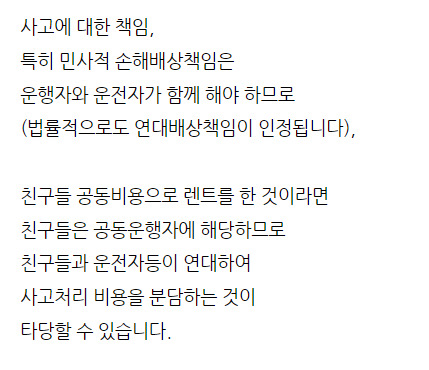 물적 피해만 있는 사고에서 같이 돈을 내고 렌트를 했다는 것만으로 공동으로 손해 배상 책임을 지는 것은 아닙니다.