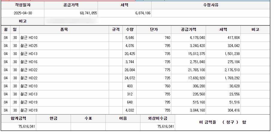 건설현장이고 철근자재를 처음에 75,616,041만큼 매입했다가 실사용은 적게 들어가서 -67,105,468 마이너스 계산서를 받았는데 문제는 04/30일에 발행된 75,616,041를 수정발급해야하는걸로 아는데 거래처에서