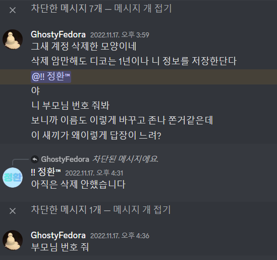 상대는 외국 해커를 이용해 상대방을 해킹하고 개인정보 및 부모님 사진 자신의 자신을 유포하고 다니는 사람입니다.