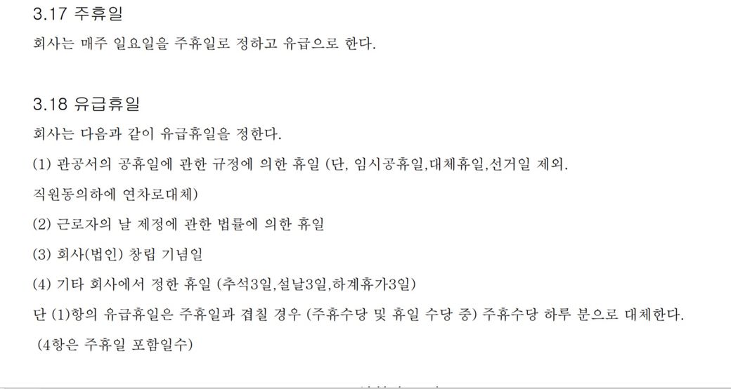 취업규칙이 아래와 같을 때, 회사 창립기념일이 일요일일 경우(근무안함),