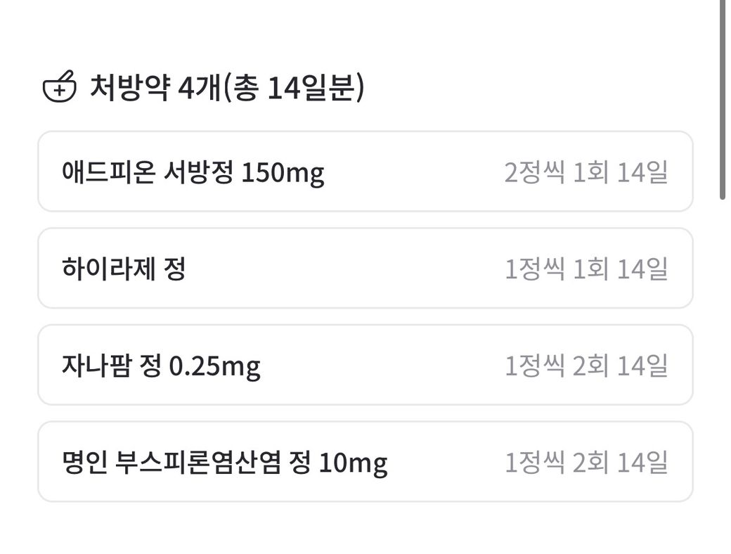에드피온 서방정, 하이라제 정, 자나팜 0.25mg, 명인 부스피론염산염 정 10mg 이렇게 복용하고 있습니다