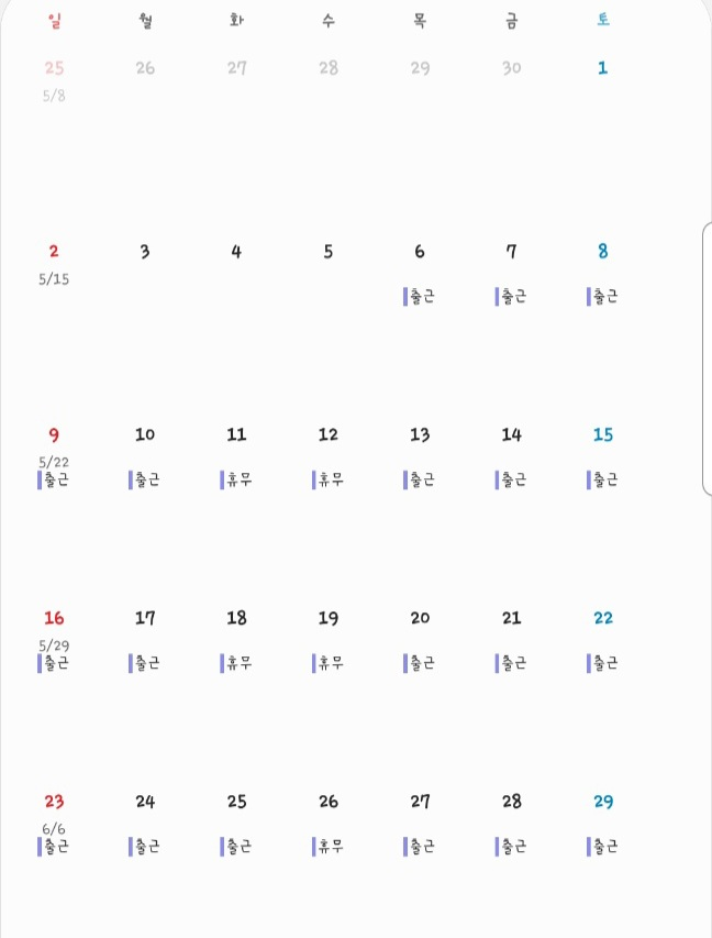 근무표에 따르면 주 5일 근무 후 휴일을 받은 것이 3번이므로 주휴수당은 3일치를 받을 수 있습니다.