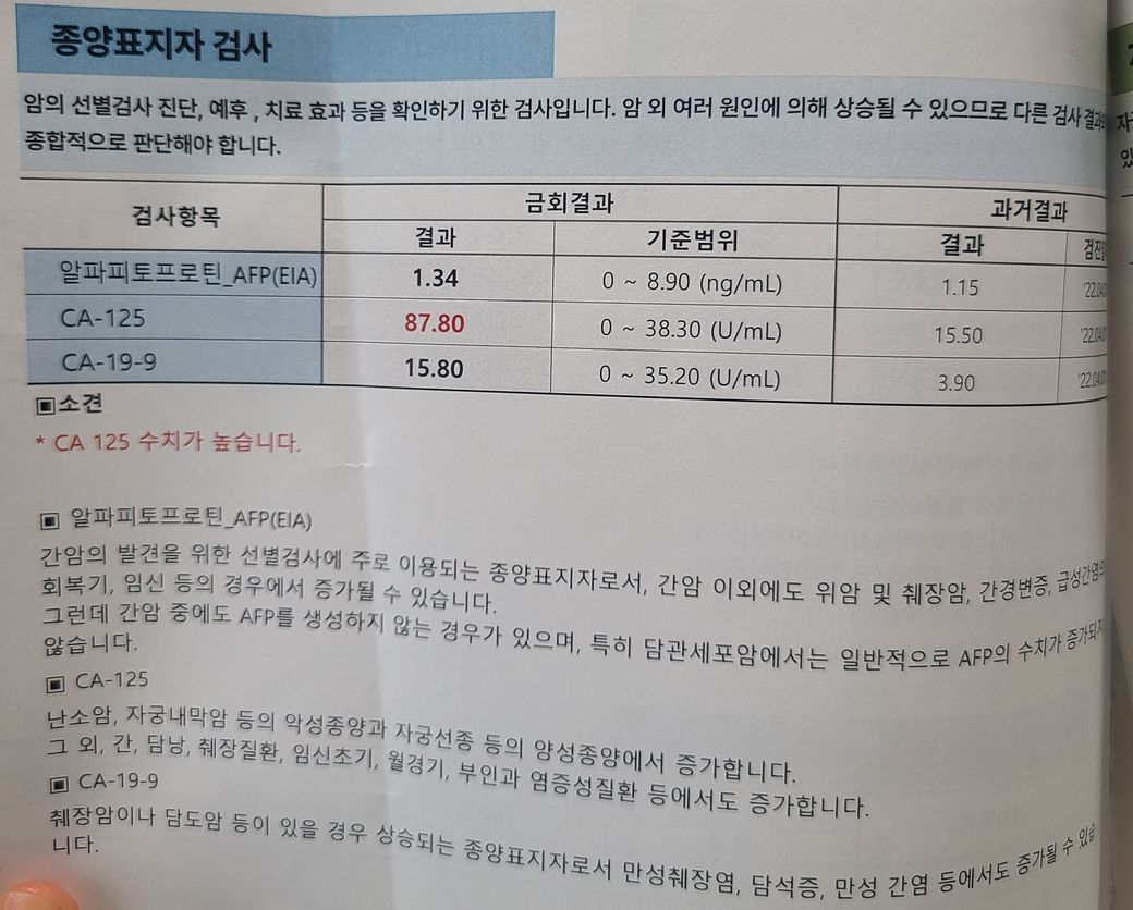 제목 그대로 ca-125가 작년에는 15.50였는데 이번 검사에서는 78.80입니다.