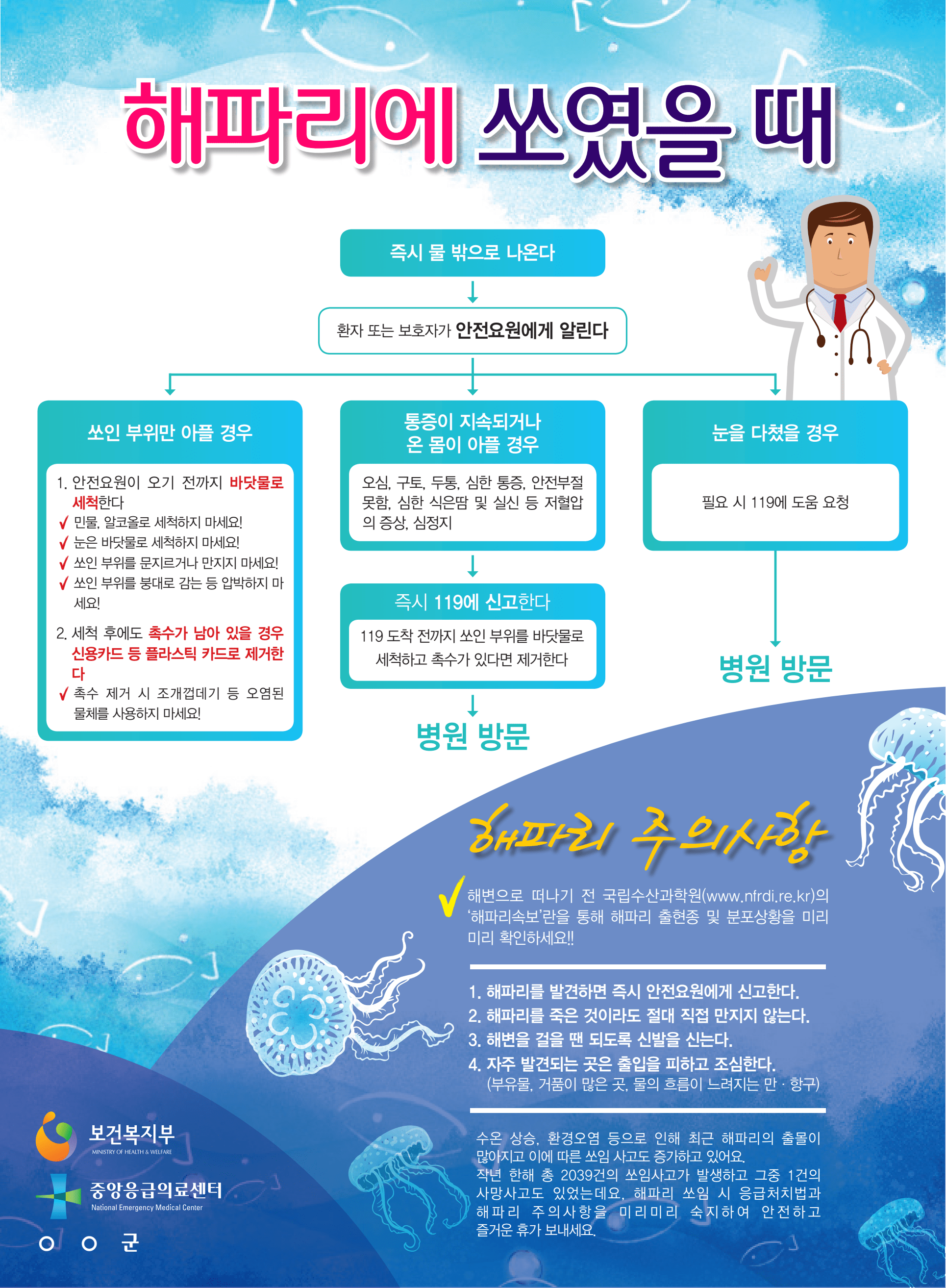 전신증상이 동반된 상황이 아니라면,안전요원이 오기 전까지 바닷물로 쏘인 곳을 세척하고,