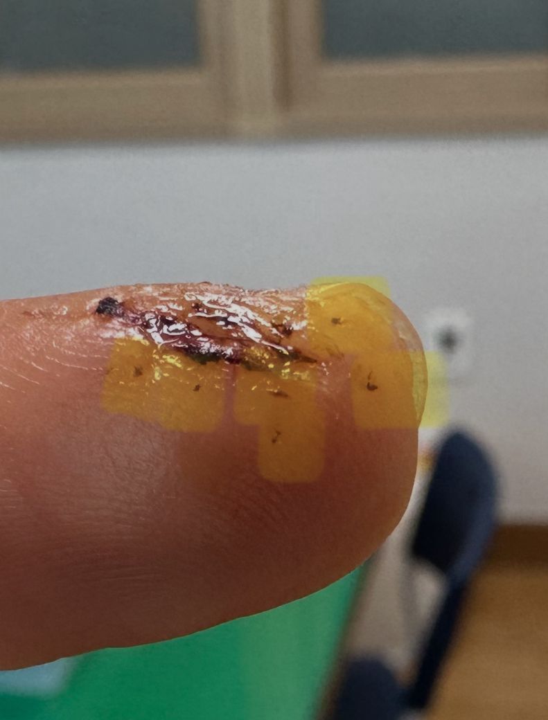 일곱바늘 꿰매고 실밥제거했는데 다 제거가 안되었어요. 노란색부분들이예요.